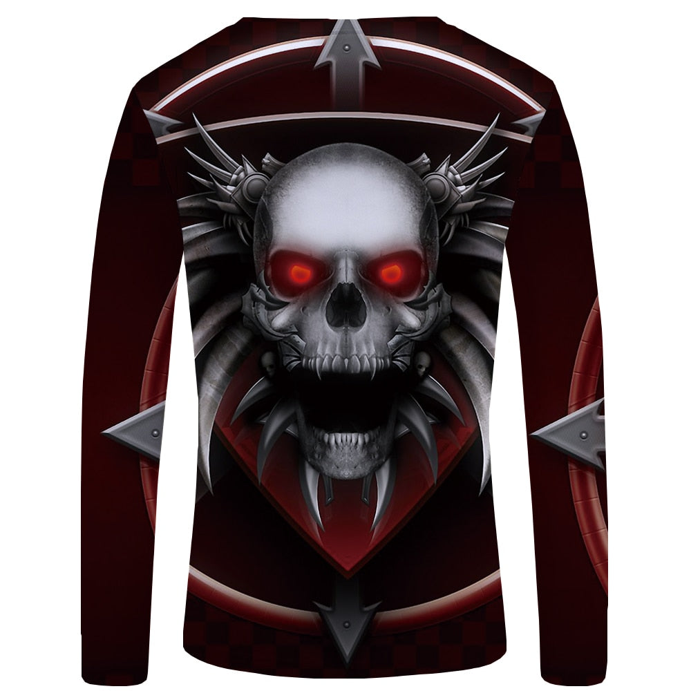 Tired of everything? Tired of the people that disrespect you, the routine at your job? Get yourself this magnificent and unique red eyes long sleeve skull shirt, and start your rebellion! As you can see, it has a gorgeous look, starting with the dark red that covers the entire background, followed by the iron skeleton head in the middle with his open mouth that leads to dark inside, he also has sharp teeth, and imposing wings behind him, and shiny red eyes!