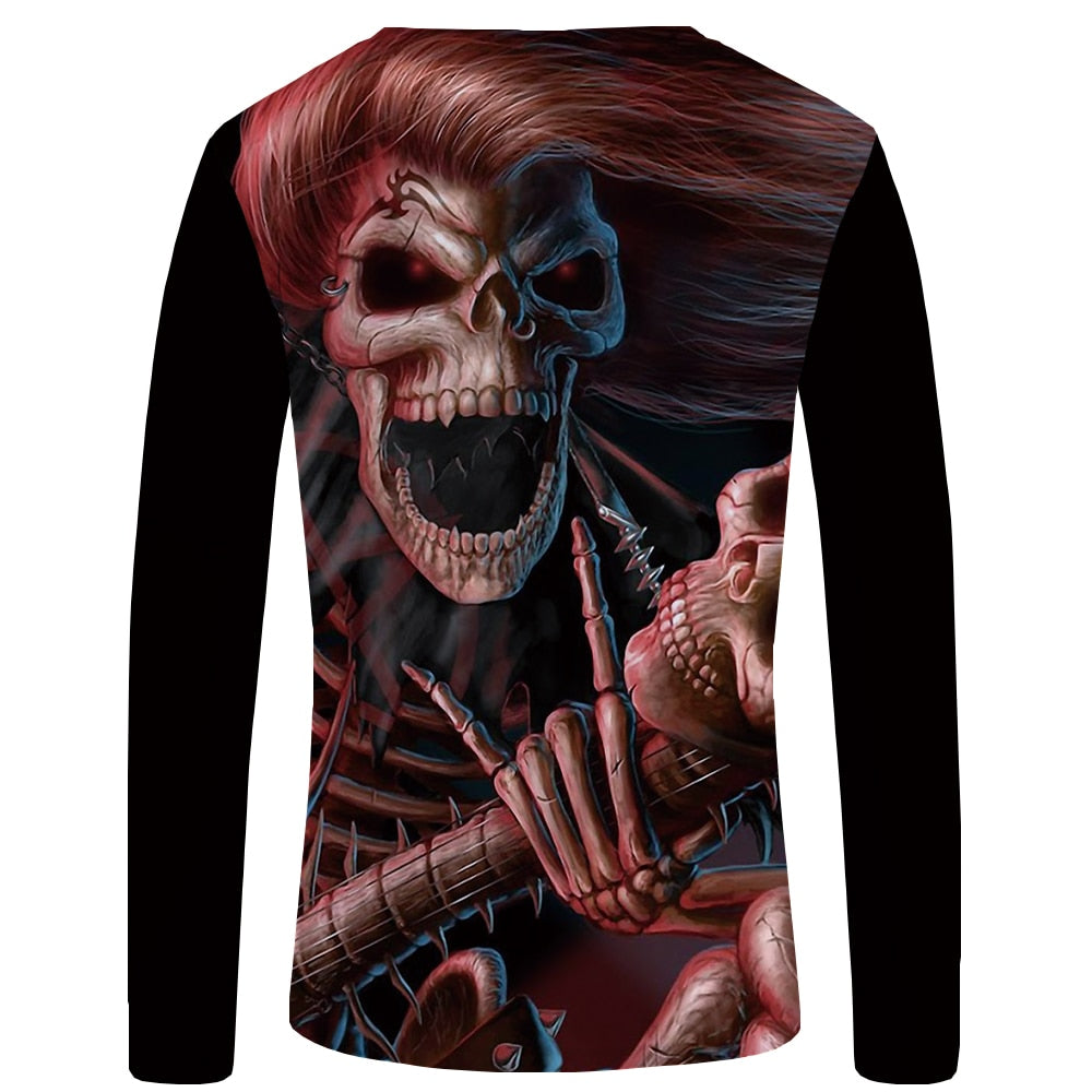 Are you a real metalhead? Do you enjoy banging your head with your hair going inside of your eyes while listening to your favorite band? If you think you are worthy of this metalhead skull long sleeve shirts get it as fast as you can! As you may have seen, it has a gorgeous and unique look, starting with the sleeves that are totally black, and make a difference between the front and the back design of the skeleton screaming, he has red eyes, frowning eyebrows, he is also holding a guitar made out of the spine of another human, and he is making the rock sign while playing his favorite song!