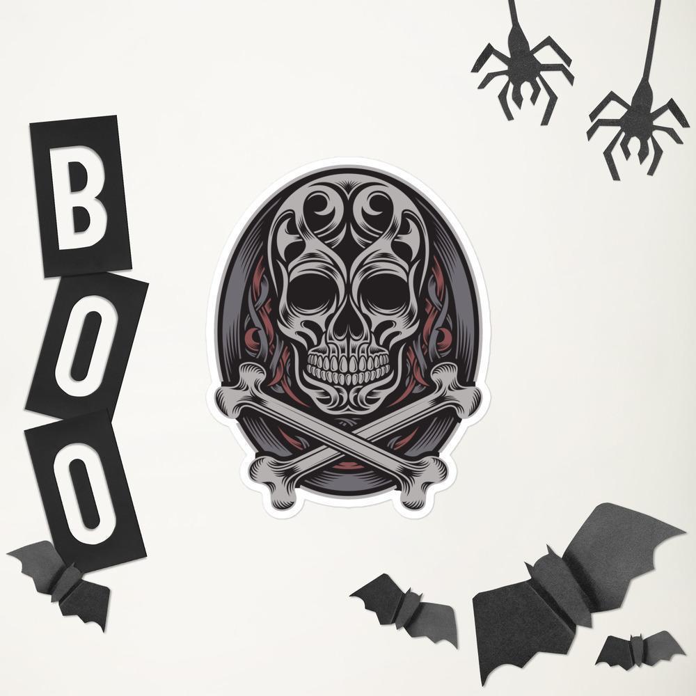 These skull and bones wall stickers are perfect to hang on your walls, to scare people, or to just simply decorate your room! As you may have noticed, it has a really simple design and colorimeter, and that makes it match almost every wall painting! Starting with the dark grey circle that highlights the rest of the details, followed with the light grey skull head that has round eyes, and a well-detailed set of teeth, and last but not least the background full of dark grey and cardinal red leaves that crosses each other.