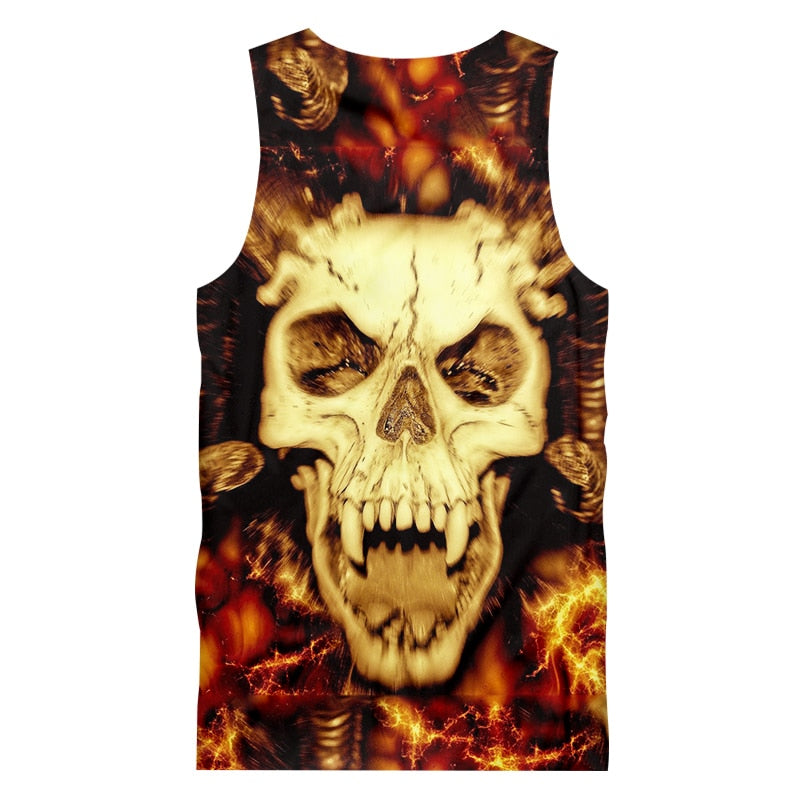 Real alpha males have a unique style of outfit, their style! No one can ever tell them what to wear, and this magnificent skull tank top male will improve your style that is already the highest! As you may have noticed, it has a really simple design, and it is very colorful, starting with the background of the front side of the shirt, which is in black, and different shades of brown and orange, making the screaming skull head in the middle look like he is in hell. For the skull head, he has few cracks, frowning eyebrows, and sharp teeth!